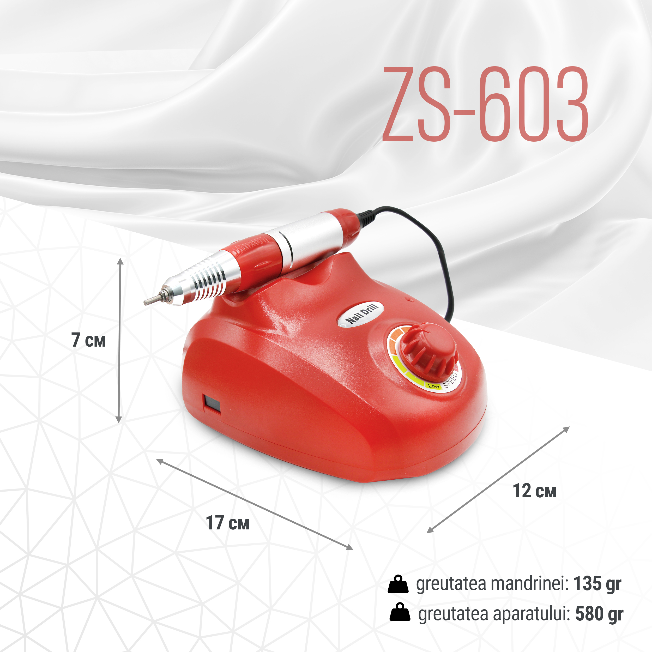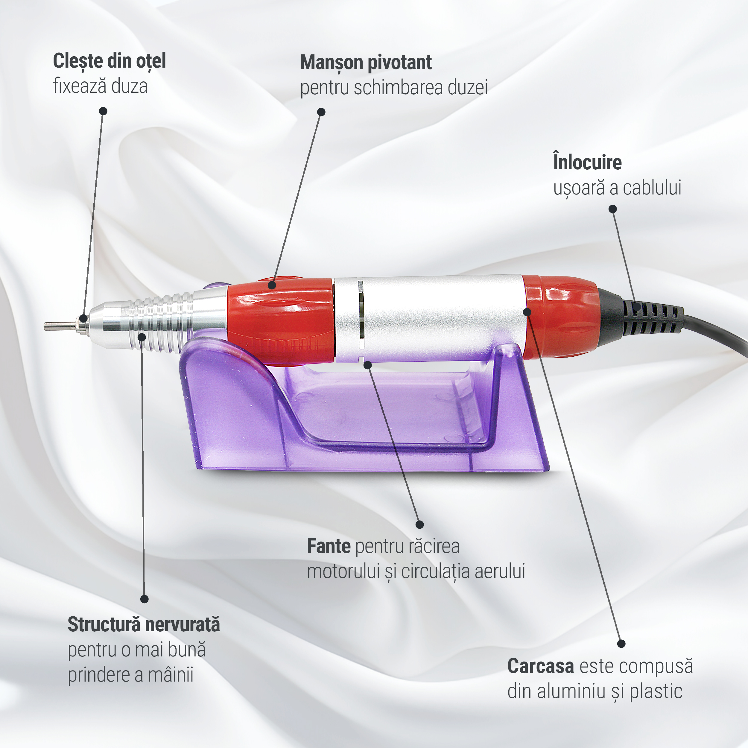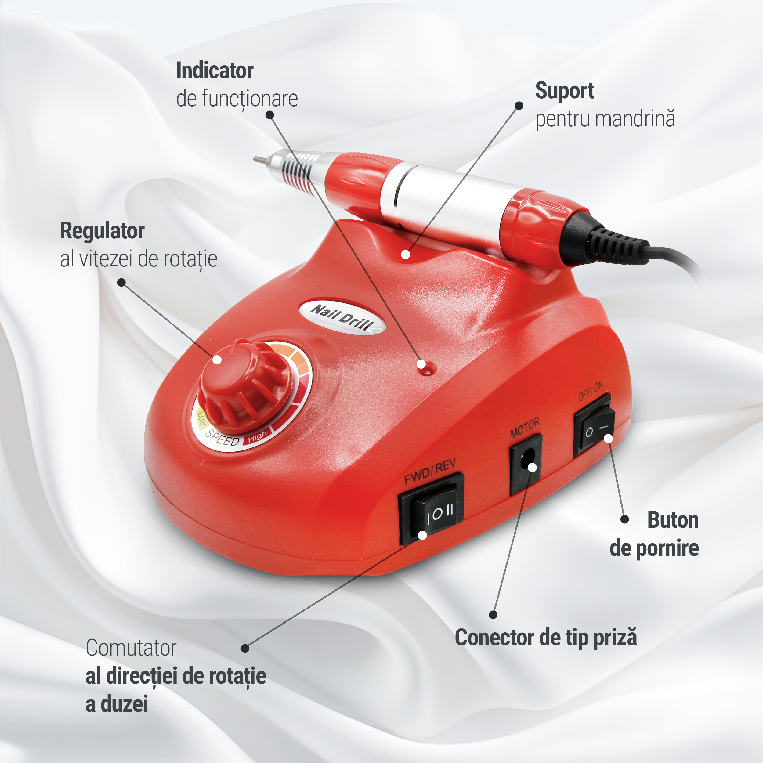 Continut pachet: unitatea centrala, mandrina, suport pentru mandrina, pedala, 6 x capete de freza, 6 x capete de slefuit cilindrici, suport bituri, manual de utilizare.